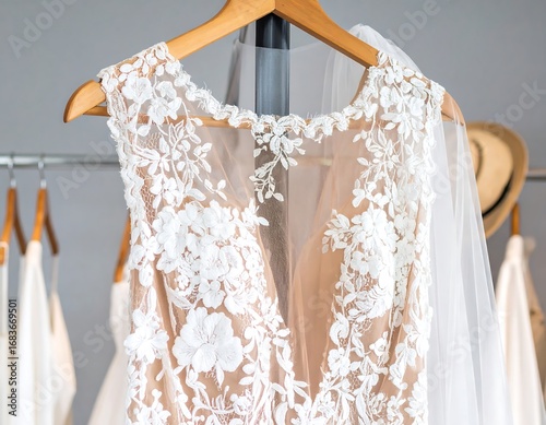 dress, wedding, lace, elegant, beige, white, floral, hanging, hanger, fabric, clothing, gown, fashion, bridal, accessory, silhouette, sleeveless, detail, texture, design, luxury, detail, light, room, display, showroom, boutique, soft, delicate, cream, apparel