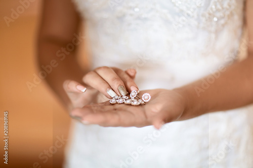 Wedding earrings on a bridal hand, bride's morning and jewelry accessories and decoration concept, selective focus