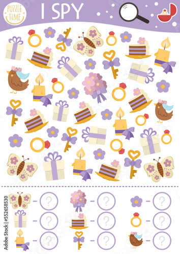 Wedding I spy game for kids. Searching and counting activity with traditional symbols. Marriage ceremony printable worksheet. Simple spotting puzzle with ring, bouquet, candle, present.