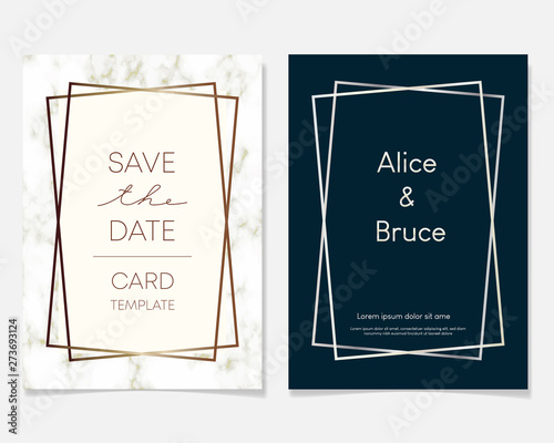 Wedding Invitation card design with golden frames and marble texture. Luxury marble with gold geometric frame design template.