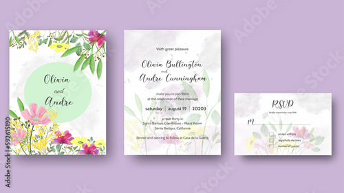 Wedding invitation template card set with flowers watercolor. Set of rustic wedding cards. Wedding invitations in watercolor style.