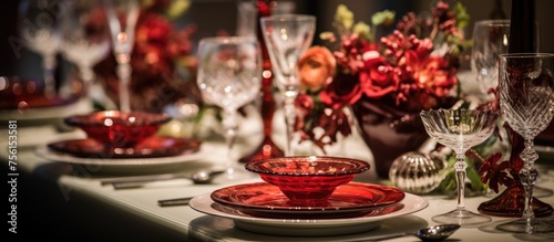 Wedding table decor and glassware at a gallery.