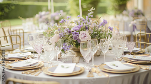 Wedding table decoration with lavender flowers, sweets and cake