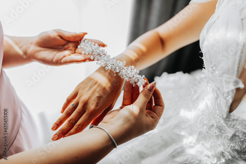 Wedding theme. A friend puts a bracelet on the bride. The last minutes of preparations for the wedding. Same outfit. Handmade jewelry