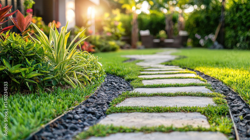 garden, path, stone, greenery, flower, plant, lawn, sunlight, nature, landscape, backyard, paseo, garden path, lush, serene, peaceful, foliage, decorative, garden design, landscaping, tranquil, summer, vibrant, relaxation, scenic, horticulture, ornamental