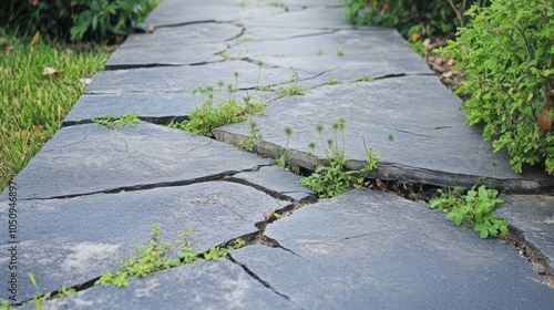 Weeds growing between the cracks of a garden walkway breaking and damaging the surface
