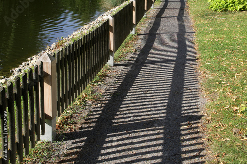 way, footway, fence, fence, shadow, grass, duck pond, water