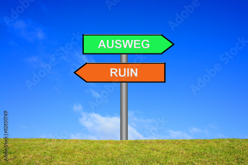 bust, ruined, bankrupt, insolvency, debit, plate, get away, assistance, consultation, arrow, signpost, crisis, depression, resolution, salvage, signs, pointing, decision, red, green, or, information board