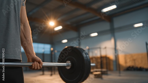 Weightlifter in Gym Spotlit During Night Shift in Warehouse Setting with Barbell and Weights