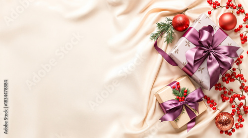christmas gift, christmas, gift, gift box, xmas decoration, loop, purple, christmas bauble, firbranch, tree decoration, festive, elegant, luxurious, winter, holiday, advent, background, copy space, beige, topview, panorama, horizontal format, frame, minimalist, still life, decoration, banner, surprise, seasonal