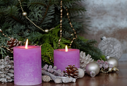candle, christmas, decoration, christmas bauble, candle, christmas decoration, background, firbranch, tree, tap, fir cone, christmassy, advent, candlelight, purple, heat, natural, traditional, candlelight, advertising space, sting, flames, christmas decoration, festive, elegant