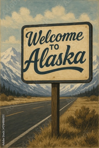 welcome, alaska, signs, vintage, travel, poster, road, trip, mountain, landscape, retro, illustration, adventure, wilderness, snowy, peak, tour tourism, scenic, highway, roadside, american, design
