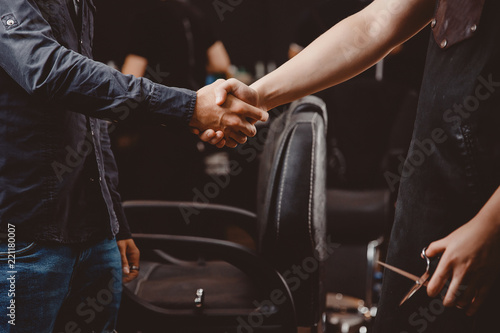 Welcome to barber shop. Customer man and hairdresser handshake, in background hair workplace armchair salon.