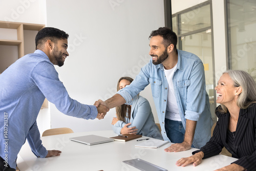 Welcome to team. Friendly candid mid aged businessman ceo leader boss shake hands with male intern applicant job seeker after successful interview glad to hire young professional on work group meeting