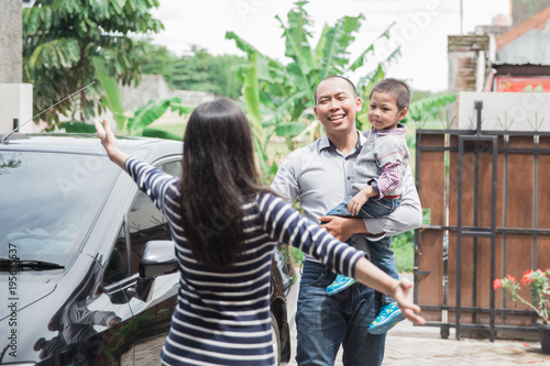 asian, boy, carrying, children, arriving, father, father, family, father, finish, gesture, girl, greeting, hand, happy, home, house, indonesian, children, leaves, lifestyle, little, love, male, man, mother, mother, office, eltern, relation, smile, standing, togetherness, welcome, woman, work, young