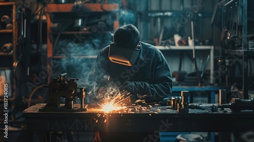 welding, men at work, metal, steel, workshop, forge, factory, work, industrial, manufacturing, industry, labor, artisan, craftsmanship, heat, spark, flames, hot, safety, gear, protective, equipment, glove, mask, helmet, metalwork, construction, engineering, machinery, tool, skill, expertise, sharpened, concentration, hard, process, craft, art, professional, trade, blue, dark, smoke, light, intense, bright, blur, detailed, background