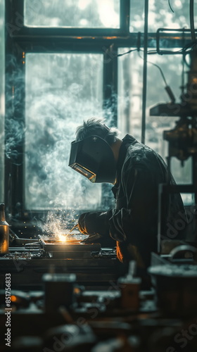 welder welding the steel and smoke background