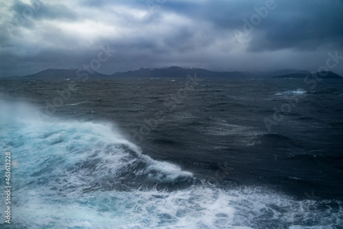 Wellen auf der Reise mit dem Schiff zum Nordkap, Norwegen. Sturm auf dem Atlantik mit Schaumkronen auf den Wellen und Gischt auf dem Schiff. dunkle Wolken werden vom Wind über das Meer gejagt. Ozean
