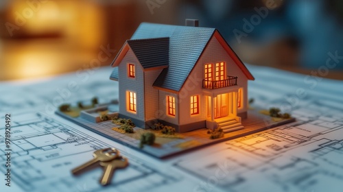 Well-lit miniature house on top of detailed architectural blueprints, with house keys nearby, symbolizing home buying, real estate investment, and property ownership.
