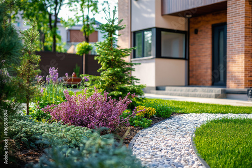 Well-maintained home garden with variety of plants and green grass lawn in front of suburban house. Modern landscaping design for outdoor spaces