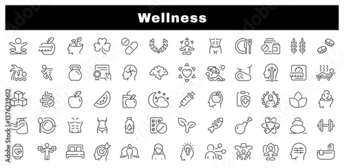 Wellness icon set. Wellness, mental health, spa, relaxation, health, exercise, diet, meditation, wellness related thin line icon collection. Editable stroke