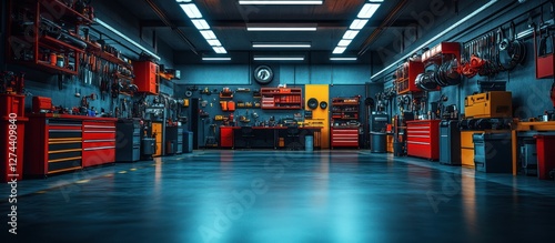 garage, workshop, tool, storage, organised, workspace, repair, maintenance, equipment, mechanic, automotive, industrial, metal, red, blue, concrete, floor, shelf, cabinet, drawer, toolshed, supply, clean, modern, bright, interior, space, cleanliness, efficient, functional, home, bricolage, renovation, construction