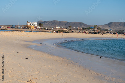West coast of Fuerteventura island. Winter sea and sun vacation in El Cotillo touristic village, Canary islands, Spain. White sandy beach La Concha..