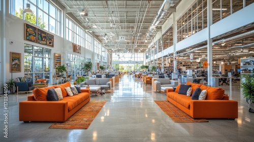 showroom, retail, design, modern, interior, furniture, store, workspace, office, building, architecture, contemporary, style, space, bright, light, airy, open, plan, layout, aesthetic, minimal, chic, sofa, orange, couch, pillow, rug, window, wall, floor, ceiling, lighting, plant, decor, atmosphere, commercial, display, product, environment