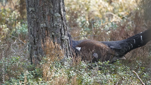 Western capercaillie (Tetrao urogallus), also known as the wood grouse, heather cock, or just capercaillie in pine forest, North of Belarus