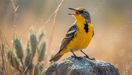 bird, songbird, wildlife, nature, animal, yellow, male, rock, field, grass, prairie, avian, singing, calling, beak, feather, wing, outdoors, wild, birding, ornithology, fauna, creature, gold, closeup, detail, sound, acoustic, communication, ecology, environment, conservation, biodiversity, wild bird, feathered, perch, stone, dry grass, summer, spring, season, territory, mating, call, photo