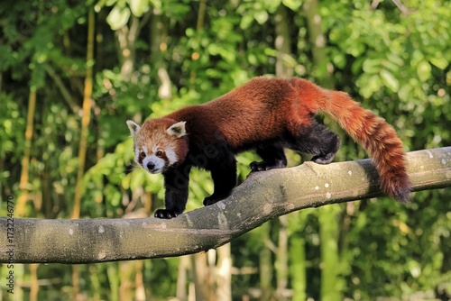 Western Red panda Ailurus fulgens), adult, on tree trunk, running, captive, Himalayas, Central Asia