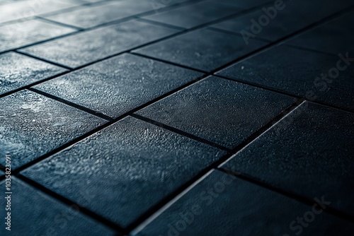 black, square, tile, tile, wet, water, dark, grey, diagonal, perspective, angle, textured, surface, pattern, design, flooring, material, background, abstract, macro, detail, architecture, interior, exterior, modern, simple, clean, minimalist, geometric, smooth, shiny, light, shadow, contrast, depth, line, grout, seamless, repetition
