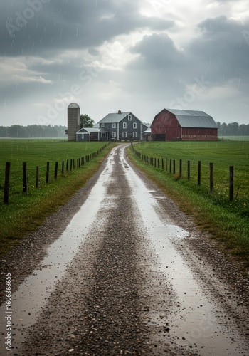 farm, road, rain, sky, cloud, building, grass, field, fence, gravel, wet, tree, landscape, rural, countryside, path, house, barn, storm, weather, nature, outdoors, farmhouse, overcast, dirt, track, grey, green, wood, post, water, puddle, distance, horizon, agriculture, farming, land, estate, property, country, lane, pathway, scenery, vista, view, rustic, rainfall