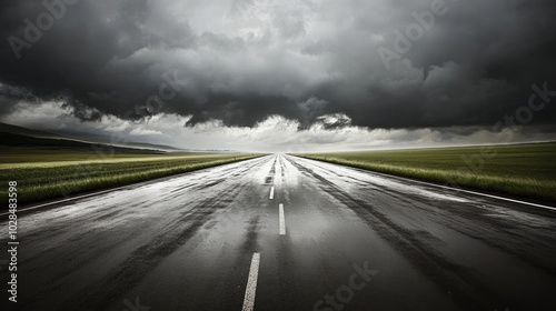 Wet Green Fields and Rain-Kissed Road Under Dark Clouds