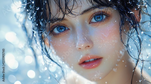 woman, girl, portrait, art, digital, painting, illustration, hair, wet, water, drop, blue, eye, face, skin, lip, beauty, model, close, up, expression, serene, calm, pretty, gorgeous, stunning, aesthetic, intriguing, captivating, mesmerizing, alluring, beautiful, vibrant, colours, light, bokeh, background, texture, detail, sharpened, artistic, creative, masterpiece, fantasy, dreamlike, realistic, photorealistic