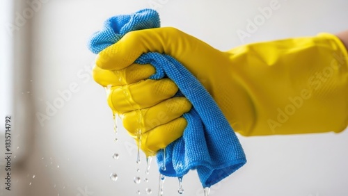 Wet rag in hand wearing protective glove for cleaning tasks. Wet rag compressed, squeezes the water out, with cleaning glove protecting skin, perfect for household chores.