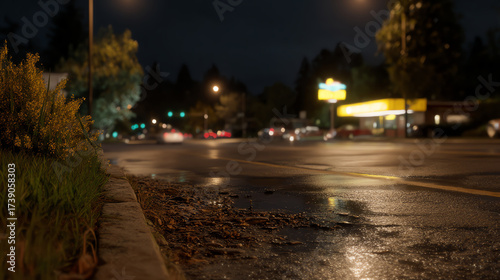 night, street, wet, light, suburban, shine, glowing, quiet, speed, illuminated, headlamp, twilight, moisture, safety, suppressing, vehicle, dusk, car, blur, infrastructure, empty, roadside, transportation, modern, traffic, calm, puddle, motion, dark, pavement, outdoors, bokeh, asphalt, yellow, evening, grass, urban, green, road, nature, street light, environment, travel, background, city, rear lamp, wetness
