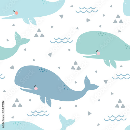Whale Seamless Pattern, Cute Cartoon Background with Blue Wave