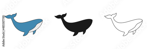 Whales animals collection. Sperm whales in different poses set. Group of ocean animals. Vector isolated on white.