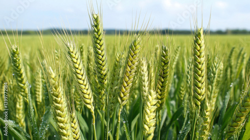 Wheat stalks stand tall in a vast green field under a clear blue sky. This capture highlights the lush growth and vitality of the crop during the summer months