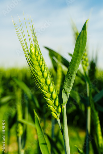 Wheatear and wheat field under blue sky