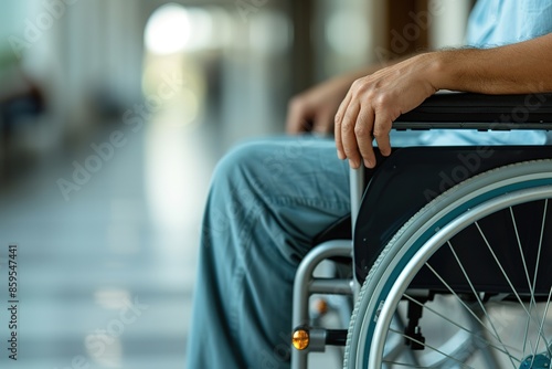 Wheelchair, disability and man hand holding wheel in a hospital for healthcare. Disabled, mobility problem and male person in a clinic for support and medical care with hands of patient and mockup