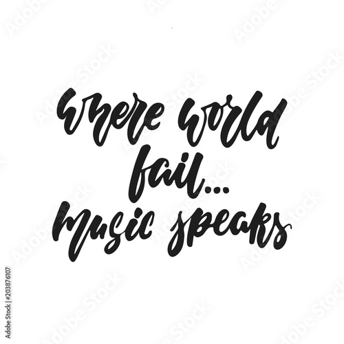 Where world fail... Music Speaks - hand drawn lettering quote isolated on the white background. Fun brush ink vector illustration for banners, greeting card, poster design, photo overlays.