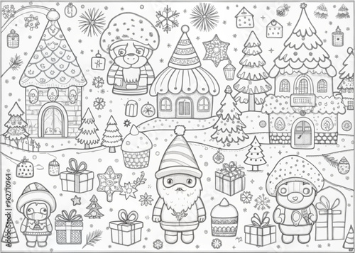 Whimsical Christmas Village with Elves for Coloring Books and Craft Projects