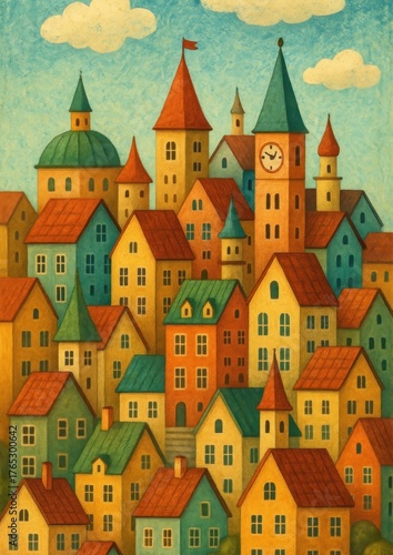 architecture, illustration, neighbourhood, clock-tower, picturesque, city landscape, storybook, city landscape, wallpaper, whimsical, artistic, building, charming, colourful, painting, rooftop, fantasy, vibrant, village, dreamy, house, mobile, scenic, fairy, tower, tale, art