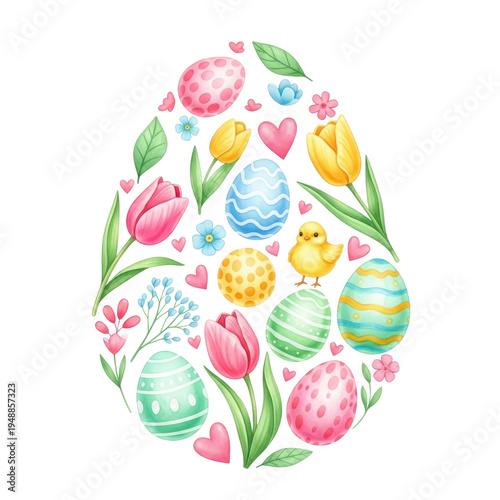 Whimsical Easter egg shape filled with colorful decorated eggs, tulips, and a chick