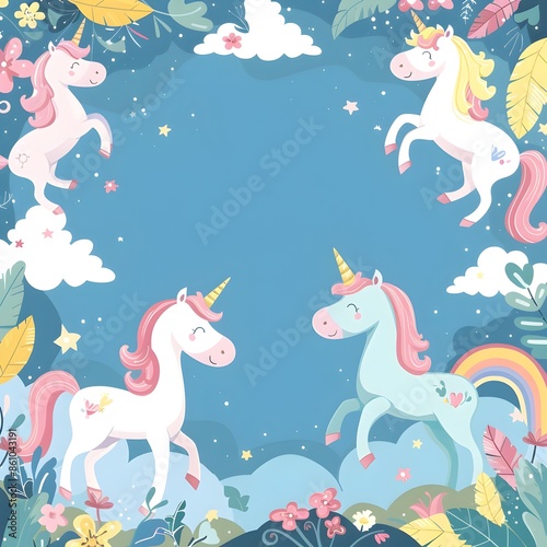 Whimsical Fairy Tale Frame with Unicorns Rainbows and Magical Elements Ideal for Fantasy Stories