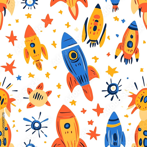 Whimsical hand-drawn pattern with colorful rockets and stars Repeating Pattern Tile Repeating Pattern Tile