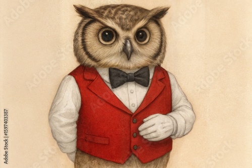 Whimsical illustration of an owl dressed as a charismatic master of ceremonies. Perfect for events, parties, children's themes, or creative projects requiring a touch of humor.