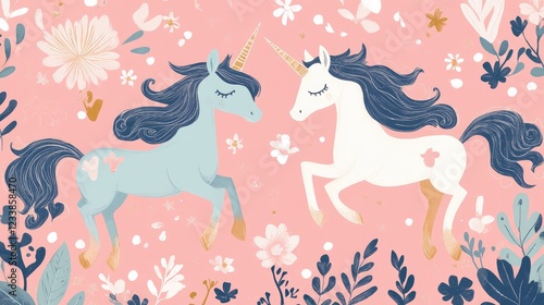 Whimsical Illustration of Two Unicorns Surrounded by Floral Elements on a Soft Pink Background